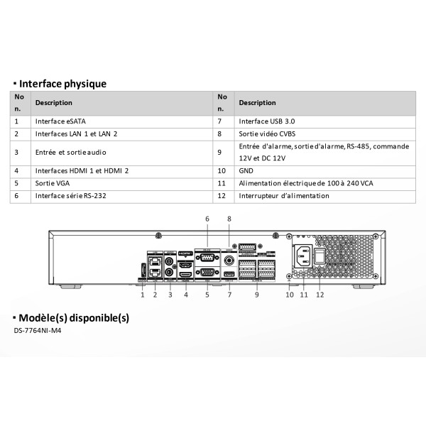 | Communication | 2 x USB 2.0 partie avant, 1 x USB 3.0 partie arrière / 2 x RJ45 10/100/1000M (Ethernet) / 2 x RS-485 / 1 x RS-232 / 1 x eSATA |
